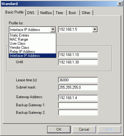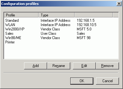 The received VendorClass-ID string is compared with the specified string. If the received string is longer than the specified string the exceeding characters are ignored. E.g. Specifing MSFT will match bothe Win98SE/ME and 2000/XP.- Profiles for requests via BOOTP forwarder or relay. One profile can be created for each relay IP address.