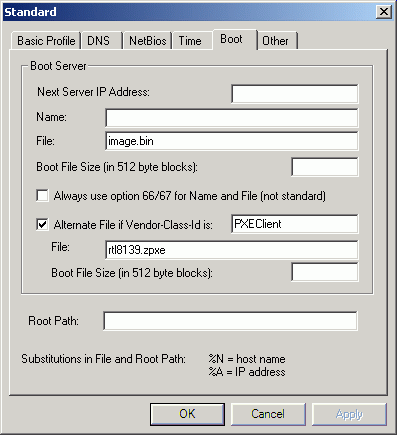 - To support 2-stage bootloaders the server can send an alternate boot file name to the client if a certain Vendor Class ID is specified in the request from the client. The received VendorClass-ID string is compared with the specified string. If the received string is longer than the specified string the exceeding characters are ignored.