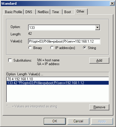 133 42 "PXopt=03;PXfile=pxboot;PXserv=192.168.1.12If the option value is a number or a sequence of bytes it must be entered byte by byte in decimal or with 0x in hexadecimal format. Non numerical values with ASCII-Codes >32 can be entered directly, e.g: