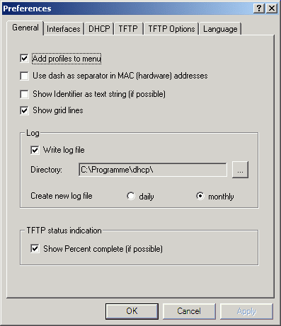 - displays a log of DHCP, BOOTP, TFTP requests. By default a log is written. If a log is not desired it can be disabled in the Preferences dialog. The software can automatically create a new log file every day or every month. The log files are ASCII text files and be easily processed using perl-scripts, etc.