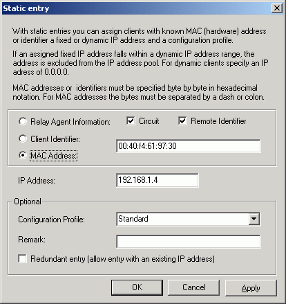 An entry for a client can be bound to a fixed IP address and a configuration profile. If the configuration profile does not exist you are prompted for setting up a new profile. The same address or identifier can be bound to more than one IP address if a different profile is used. Checking the "Redundant entry" option two or more addresses or identifiers can be configured with the same IP address. The option is intended for preconfiguring backup equipment. If an equipment fails, the hardware can be replaced by a already registered backup module without modifying the server configuration at the time of failure.If the IP address is set to 0.0.0.0 the client will receive an IP address from the dynamic IP address pool of the configured profile.