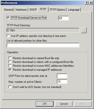 TFTP download can be restricted to registered addresses/identfifiers and/or known boot files only.The haneWIN DHCP server is the professional solution for all Win32 platforms
