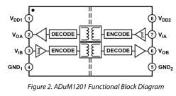 In a second version of the DDS-VFO I added three ADuM1201 boards to isolate the VFO from the RPi. Like optocouplers the ADuM chips isolate input and output. The ADuM1201 is symmetrically and offers one input and one output per side. The ic can also do 3.3V to 5V conversion.