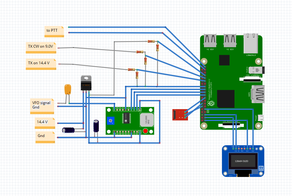 Simple voltage dividers are used to adapt the three lines TX on, TX-CW on, 5V to three GPIO-in input lines (max. 3.3V) of the RPi: